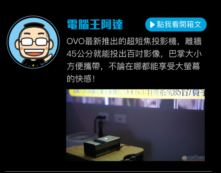一款螢幕可以變大變小、輕鬆帶來帶去、離牆45公分投影百吋的超短焦1080P智慧投影機。高亮度、高性能,整合ToF極速自動對焦、獨家6向自動梯校、5W+5W強勁音效及豐富影音內容。上市售價 43,980 元,贊助預購只要 6 折 26,388 元!4/22 止