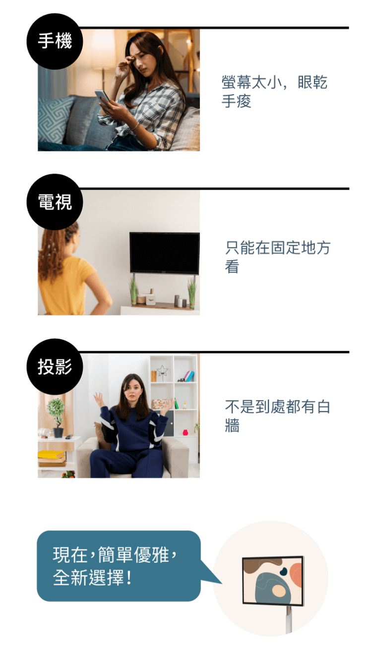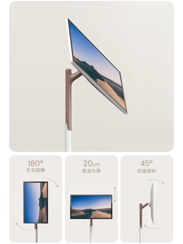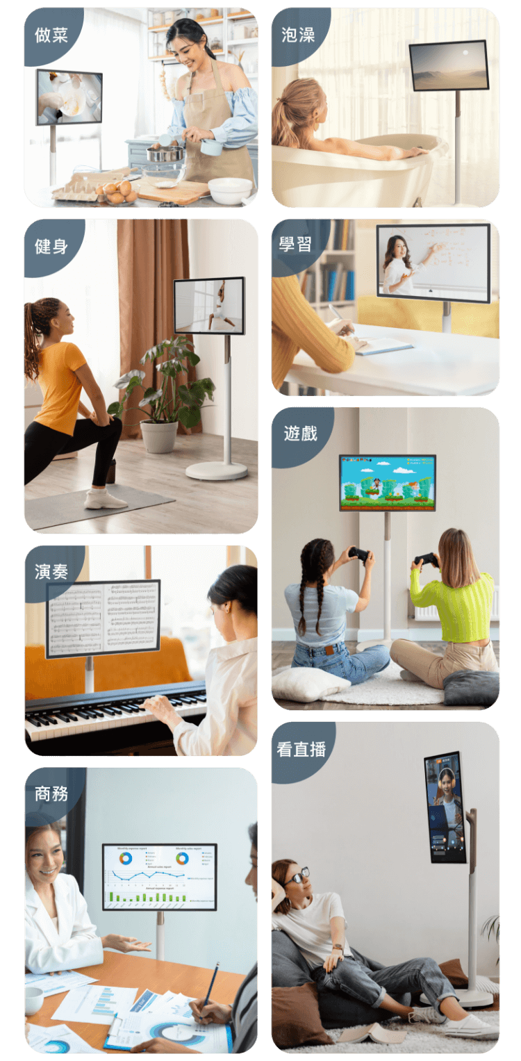 底座附萬向滾輪,滑順好推,螢幕可旋轉180⁰,躺平追劇、做菜、泡澡、健身、學習、演奏、遊戲、商務、看直播,通通沒問題。