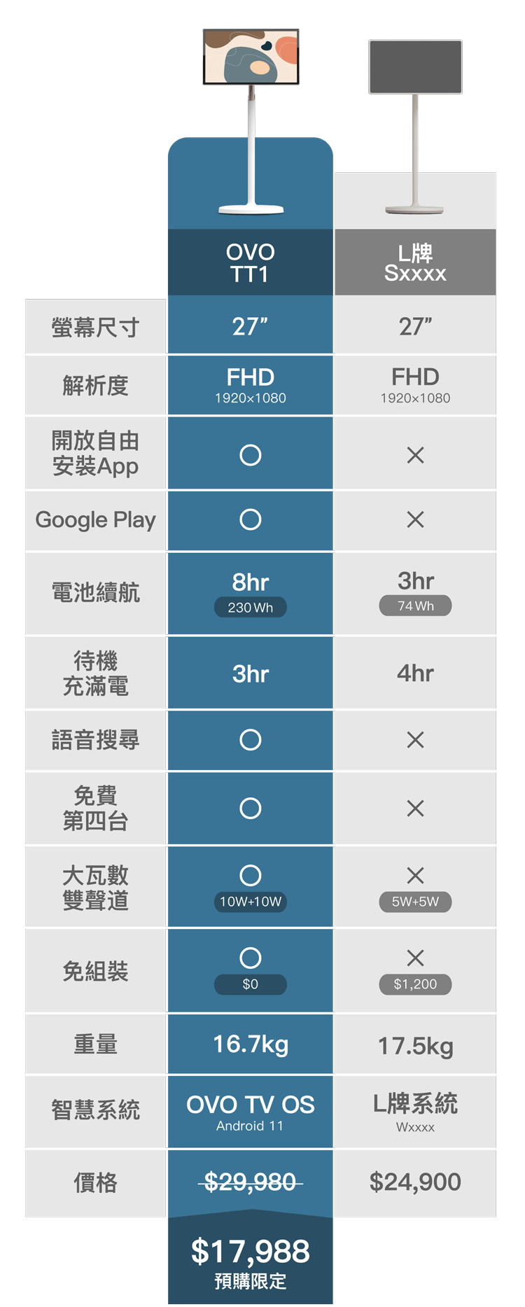 邀請您用上市後買不到的價格,贊助OVO推推閨蜜機可移動電視。上市售價 29,980 元,贊助預購只要 6 折 17,988 元。10/15 止
