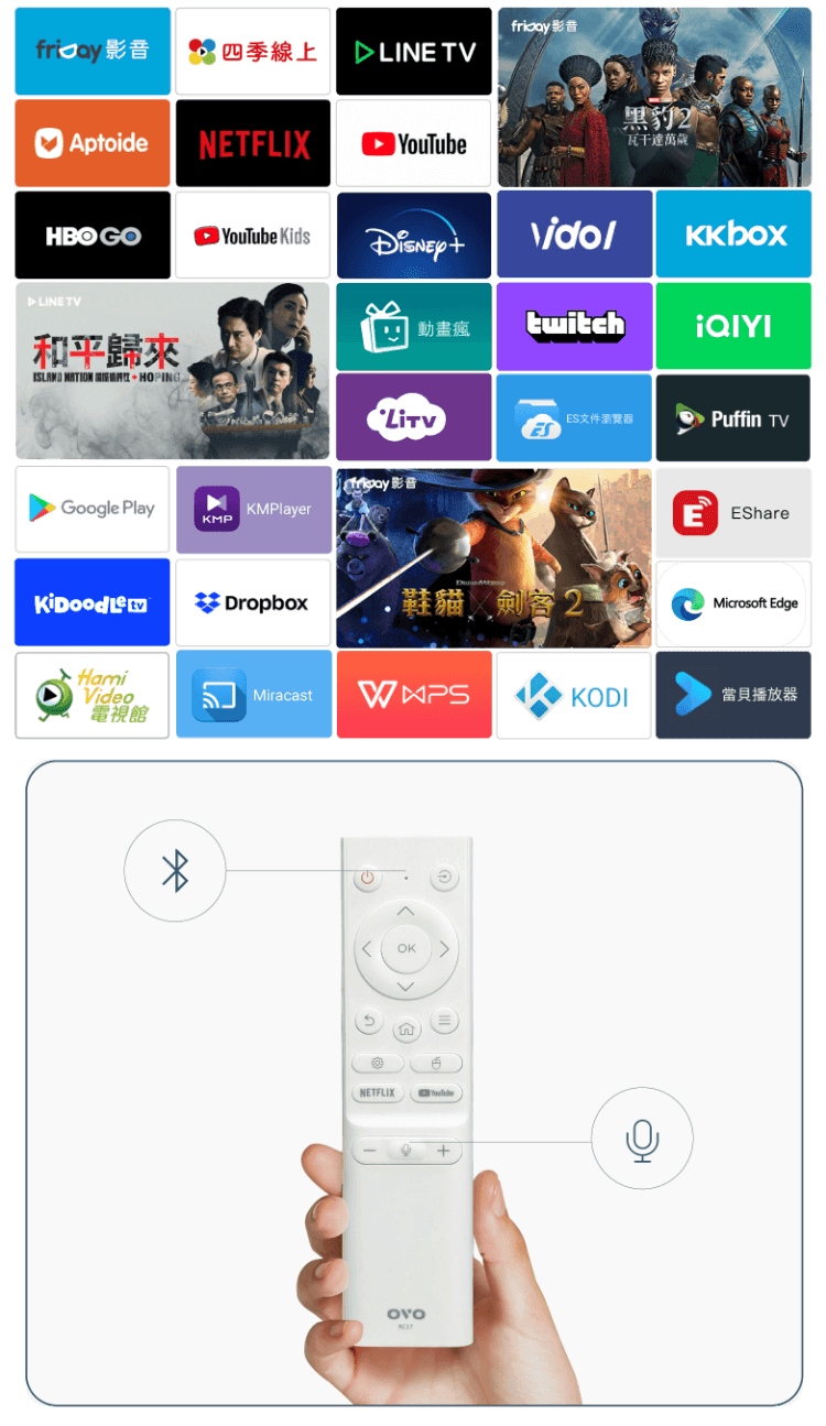 支援 OVO 應用商店、Aptoide TV 與 Google Play 三大商店。附藍牙語音遙控器,想看什麼用說的。