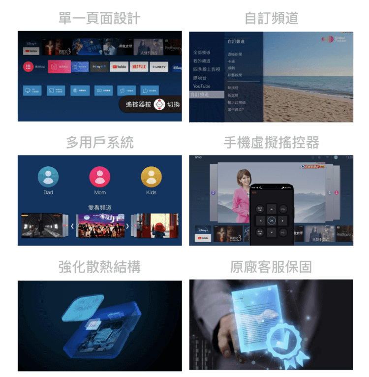 一款台灣研發、獲美國專利、整合正版串流第四台的4K智慧電視盒。支援豐富影音APP、合法免費頻道超過30台,還有開機直接看電視、手機筆電全投影等眾多特色。