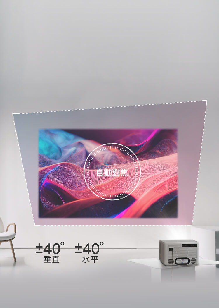 - 自動對焦、自動梯形校正、支援側投,擺脫空間限制