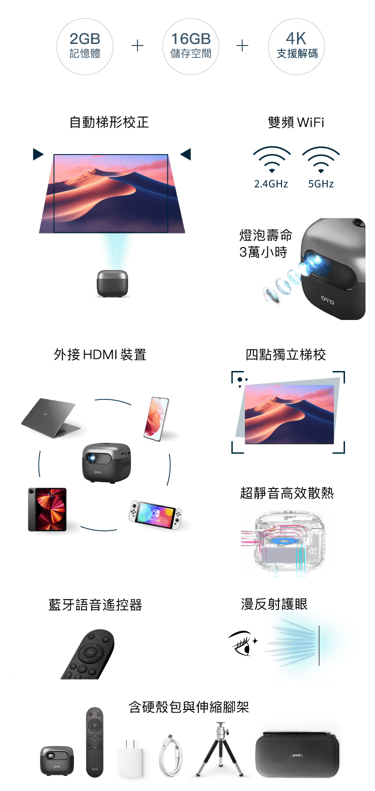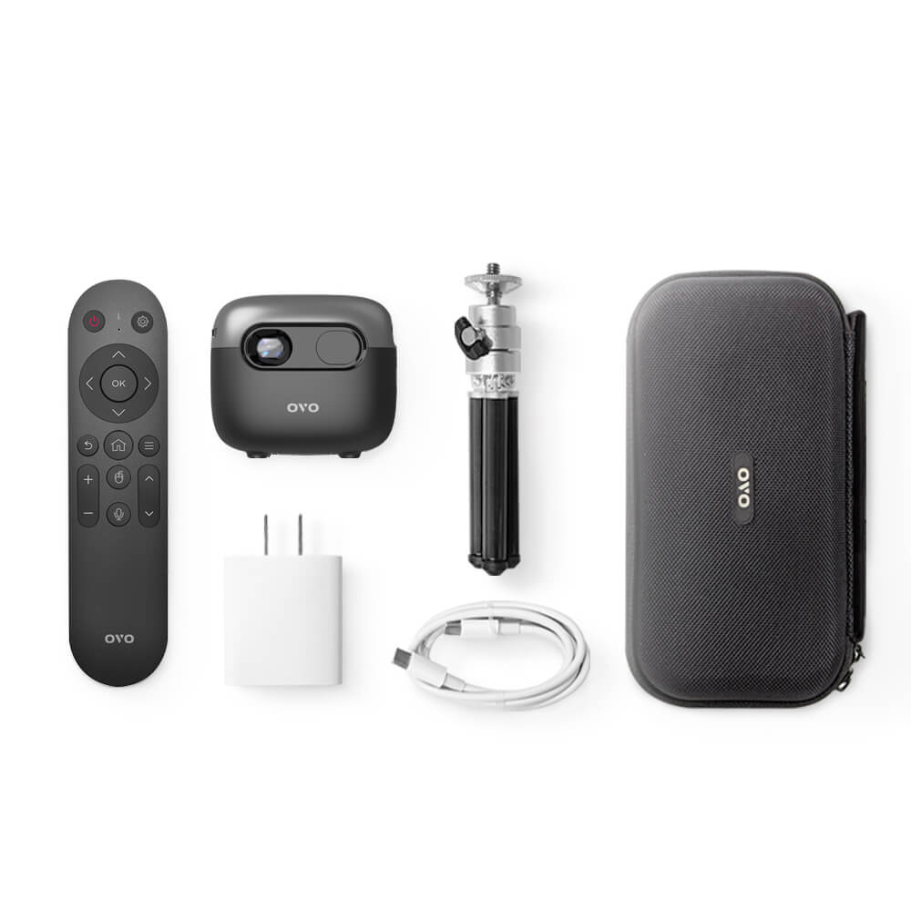 OVO 小蘋果U1-B*1 、藍牙語音遙控器*1、便攜收納包*1、Mini腳架*1、4號電池*2、電源供應器*1、電源線*1、使用說明書*1、四季線上30天*1、friDay影音30天*1