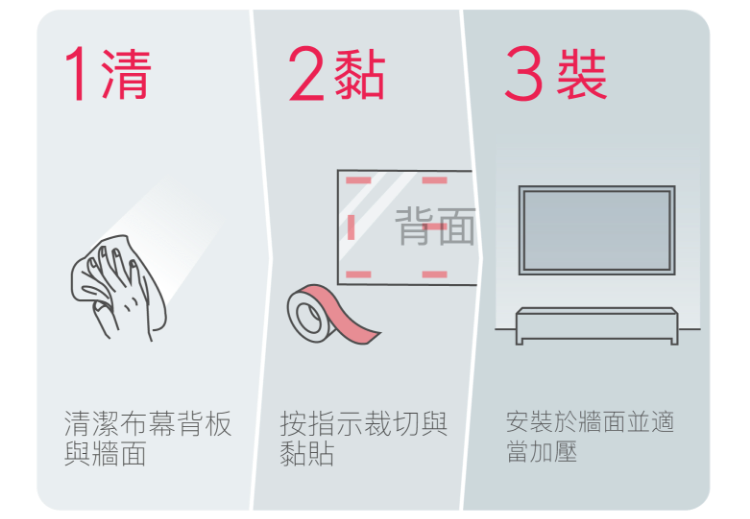 適用多種牆面,黏著穩固,不需鑽孔。1清 2黏 3裝簡單3步驟安裝。