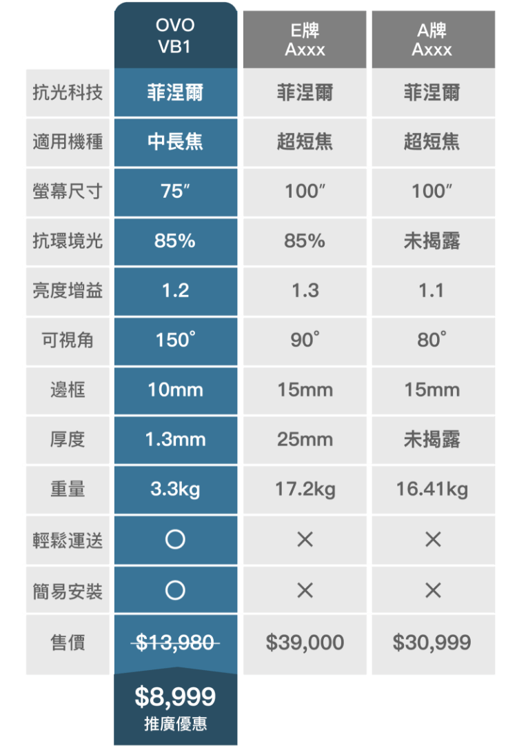 採用最頂級的菲涅爾抗光科技,專為一般中長焦投影機(投影比≥1)設計,OVO、Warpple、幫康及任何品牌投影機都能使用。