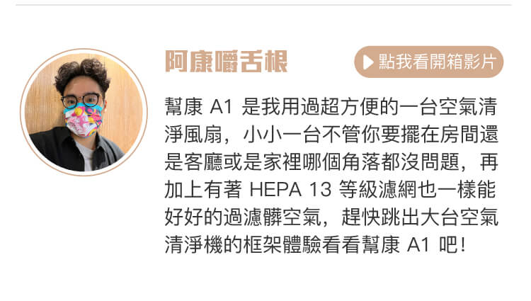客廳、小孩房、主臥室、廚房,到處擺一台,空氣潔淨、涼爽舒適、生活品質有保障。若是小資族的小坪數生活空間,一樣可以讓幫康 A1 幫你把關健康!