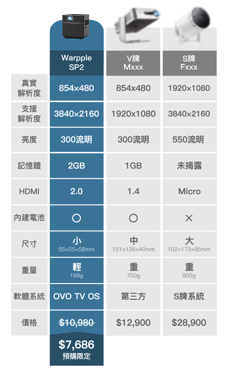 邀請您用上市後買不到的價格,贊助 Warpple 小方塊智慧投影機 SP2,上市售價 10,980 元,贊助預購只要 7 折 7,686 元!