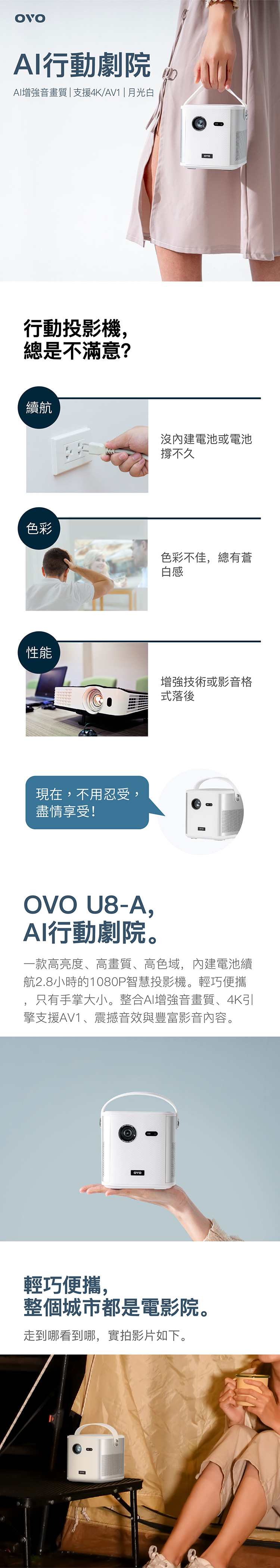OVO U8-A | AI行動劇院 | AI增強音畫質、支援4K/AV1、月光白