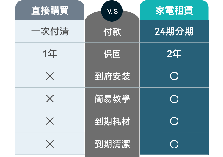 合約期間24個月,幾乎0利率的分期付款,免費延長保固,還有多種尊榮服務可選,租比買更划算。
