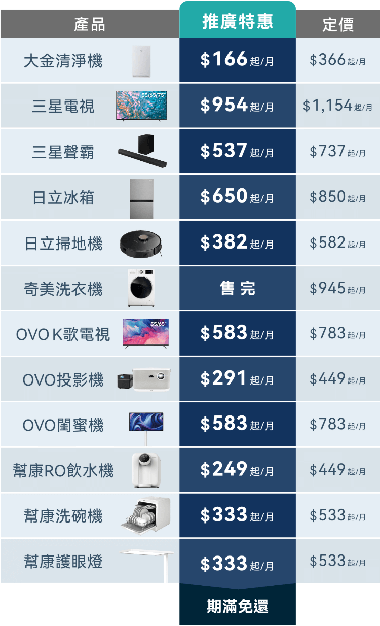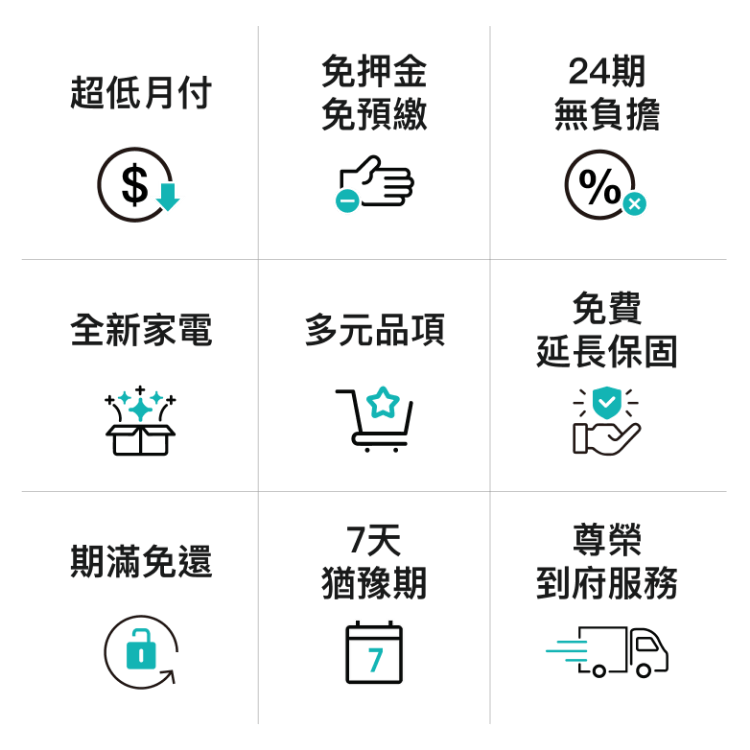 一項超低月付、全新家電、多元品項、期滿免還的新型態家電租賃服務。擁有免押金免預繳、24期0利率、免費延長保固、尊榮到府服務,以及7天猶豫期等眾多特色。定價 366 元起/月,推廣特惠每月只要 166 元起!