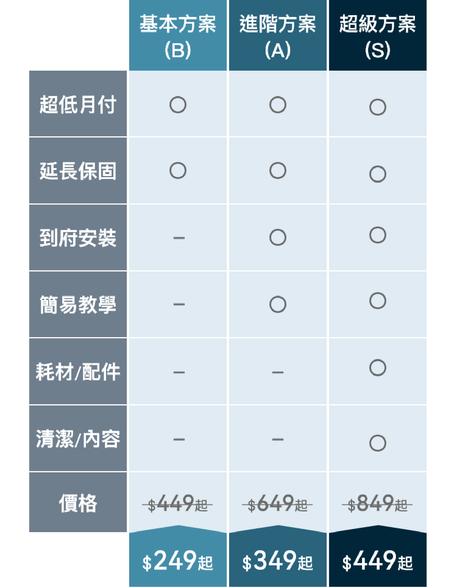 定價 366 元起/月,推廣特惠每月只要 166 元起!以RO飲水機 SR1 超級方案為例,加計飲水機、24期利息、延長保固、四年份耗材以及兩次到府服務,合理定價 849 元/月,推廣特惠每月只要 449 元!省下高達 9,600 元!